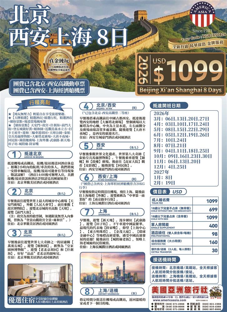 ★ 【繽紛景點】天安門,故宮,什剎海,前門大街,登長城做好漢,頤和園,近觀鳥巢水立方,打卡王府井,遊和三輪車遊胡同,天壇公園,秦始皇兵馬俑博物館,大雁塔北廣場,大嘴唐不夜城廟禎