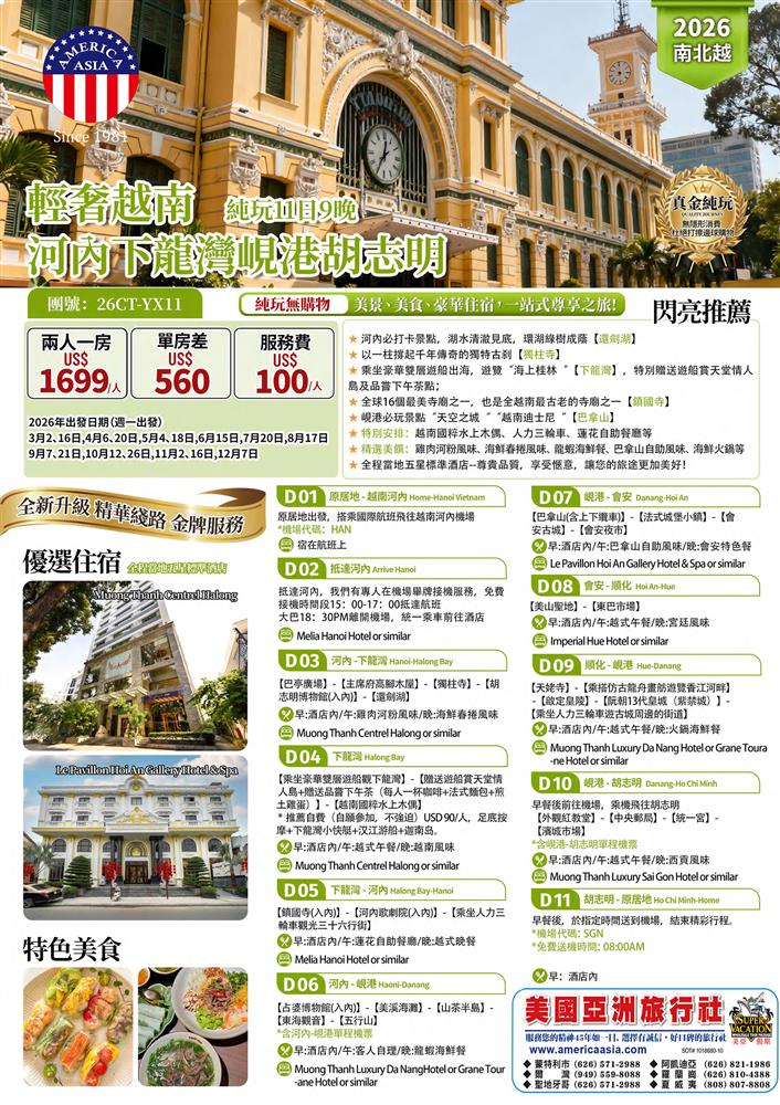 輕奢越南、 河內下龍灣、峴港胡志明、 純玩11日 (2026)